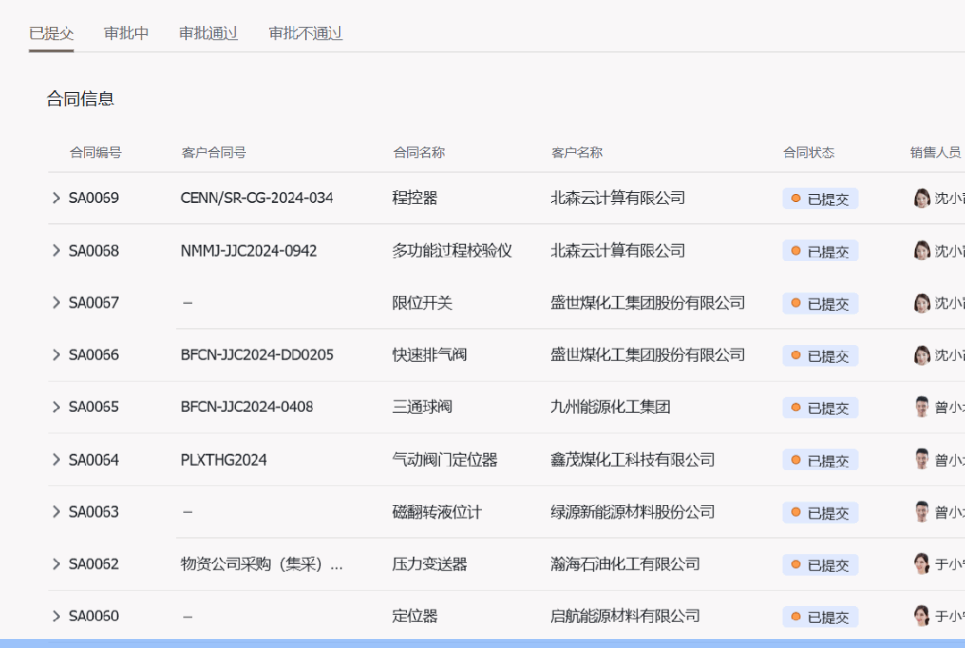 在【銷售合同】頁面中,【 聚合列表 】可以按照「合同編號」把同一編號的信息聚合在一起,點擊左側(cè)的>按鈕,可以展開詳細的聚合信息。